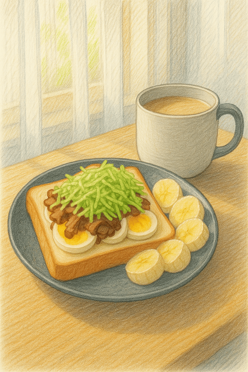 🥪トースト(食パン1枚・半割ゆで卵+刻みチャーシュー+キャベツ+マヨ+こしょう)